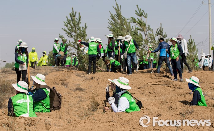 (다라더치/중국=포커스뉴스) 25일 오전 중국 내몽고 다라더치 쿠부치사막에서 2016 미래숲 15기 녹색봉사단원들이 나무 심기 작업을 하고 있다. 미래숲 녹색봉사단은 이번 봉사활동을 통해 황폐화된 사막에 나무 심기 및 각국 청년들과 우호를 증진을 위한 교류 활동을 전개했다.