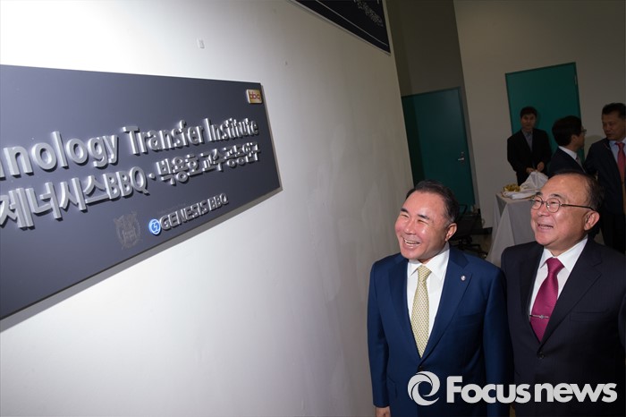(서울=포커스뉴스) 25일 오전 서울 관악구 서울대학교 수의과대학 생명공학 연구동에서 열린 서울대-BBQ 공동연구 조인식에서 윤홍근(왼쪽) 제너시스비비큐 그룹 회장과 박용호 서울대 수의과대학 교수가 기념촬영을 하고 있다.