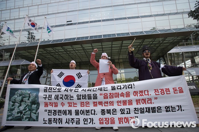 (서울=포커스뉴스) 26일 오후 서울 영등포구 전경련회관 앞에서 애국국민운동대연합 회원들이 어버이연합 억대 금품지원 규탄 기자회견을 하고 있다.
