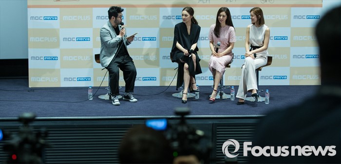 (서울=포커스뉴스) 29일 오후 서울 영등포구 여의도 CGV에서 열린 MBC 에브리원 '로맨스의 일주일3 : 여배우들' 제작발표회에 참석한 배우 김성은(오른쪽부터), 한채아, 박시연이 진행자에게 질문을 받고 있다.