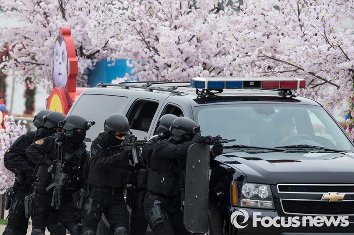 (서울=포커스뉴스) 27일 오전 서울 영등포구 여의도 한강공원 원효대교 일대에서 열린 '수도 서울 민․관․군 합동 대규모 복합재난 가상훈련'에 참가한 경찰특공대가 경계를 서고 있다.