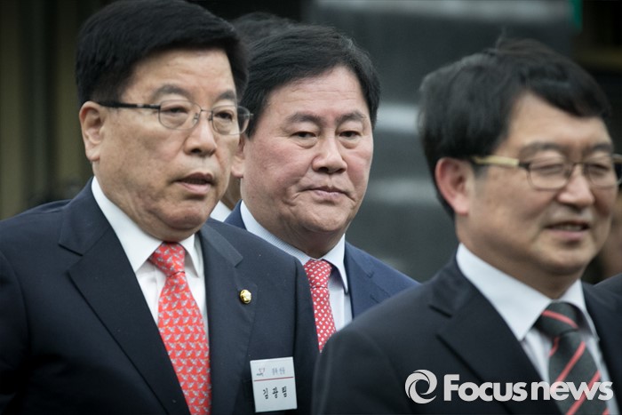 (서울=포커스뉴스) 26일 오전 서울 여의도 국회에서 열린 새누리당 20대 총선 당선자 워크숍에 참석한 최경환 당선인과 경북 지역 당선인들이 인사를 위해 이동하고 있다.