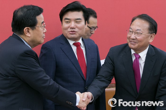 (서울=포커스뉴스) 유일호(오른쪽) 경제부총리 겸 기획재정부 장관이 29일 오전 서울 여의도 국회 새누리당 원내대표실을 방문해, 원유철(가운데) 대표최고위원 권한대행, 김정훈 정책위의장과 인사하고 있다. 이날 유 부총리는 여야 3당 원내지도부를 면담하고, 경제활성화법 등 쟁점법안 처리를 촉구했다.