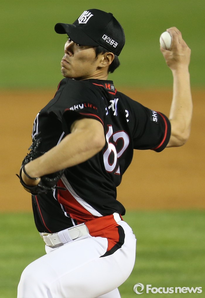 (서울=포커스뉴스) 29일 서울 잠실구장에서 열린 2016 프로야구 kt-LG 경기에서 kt 투수 김재윤이 8회말에 투구하고 있다.