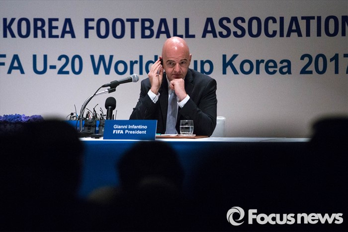 (서울=포커스뉴스) 한국을 방문한 지아니 인판티노(46, 스위스) FIFA 회장이 27일 오후 서울 강남구 아이파크타워에서 열린 기자회견에 참석, 취재진의 질문을 듣고 있다.