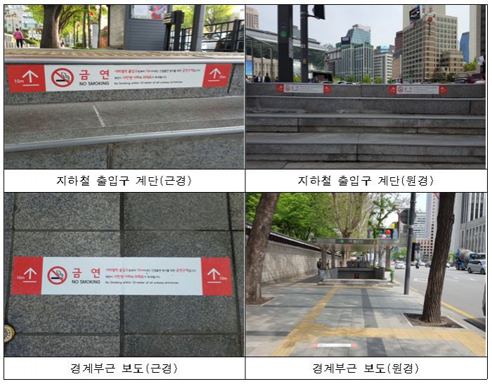 서울시는 약 2억원을 투입해 출입구당 4~8개의 금연구역 경계표시를 10m 지점의 보도 위에, 안내표지는 지하철 출입구의 벽면과 계단, 경계부근 보도에 5개씩 총 8000여개를 부착했다.
