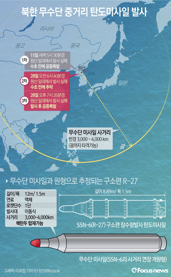 (서울=포커스뉴스) 북한이 28일 무수단 미사일을 오전과 오후 잇따라 발사했으나 실패한 것으로 추정된다.