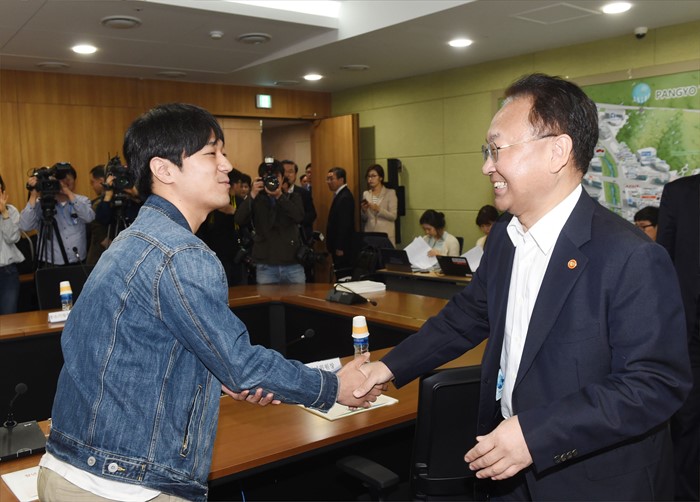 (성남=포커스뉴스) 유일호 부총리 겸 기획재정부 장관이 27일 경기도 성남 판교 경기창조경제혁신센터에서 열린 '청년.여성 일자리 토론회'에서 취업준비생과 인사를 하고 있다. <사진제공=기획재정부>