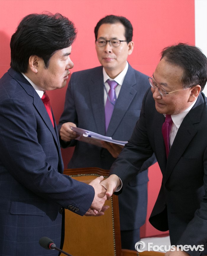 (서울=포커스뉴스) 유일호(오른쪽) 경제부총리 겸 기획재정부 장관이 29일 오전 서울 여의도 국회 새누리당 원내대표실을 방문해, 원유철 대표최고위원 권한대행과 악수하고 있다. 이날 유 부총리는 여야 3당 원내지도부를 면담하고, 경제활성화법 등 쟁점법안 처리를 촉구했다.