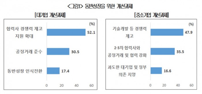 동반성장을 위한 개선과제 역시 기업들은 대‧중소기업 모두 경쟁력을 높이고 시너지 효과를 내야 한다고 응답했다.