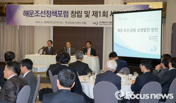 (서울=포커스뉴스) 28일 오전 서울 중구 한국프레스센터에서 열린 '해운조선정책포럼 창립 및 제1회 세미나'에 김성귀(왼쪽부터) 한국해양수산개발원 원장, 전준수 서강대학교 교수, 조규열 해양금융종합센터장이 참석하고 있다.