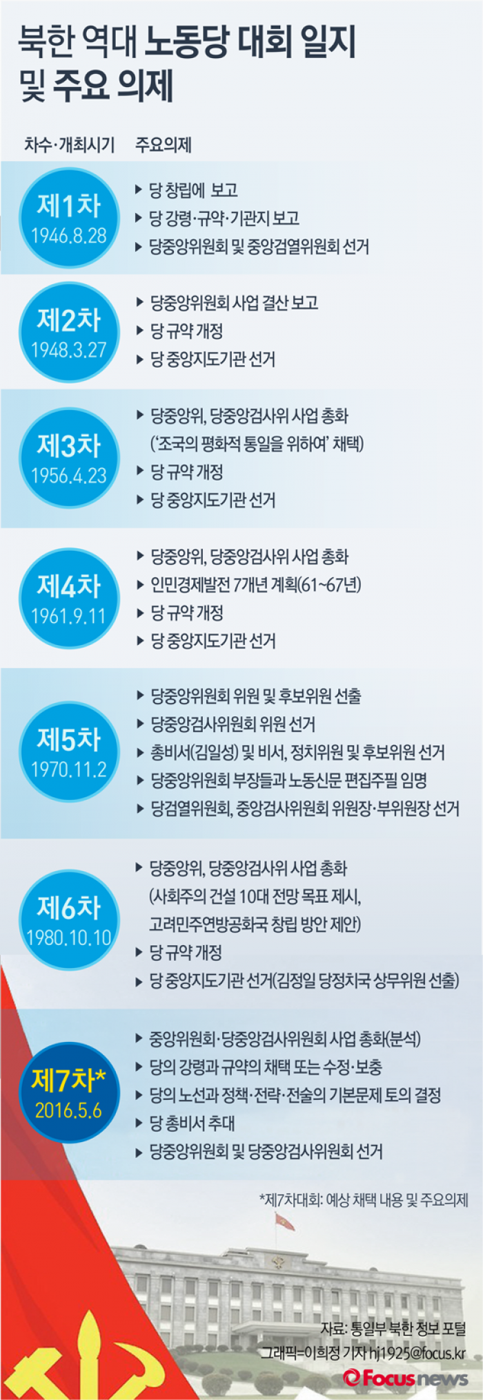 | △ [그래픽] 북한 역대 노동당 대회 일지 및 주요의제 |