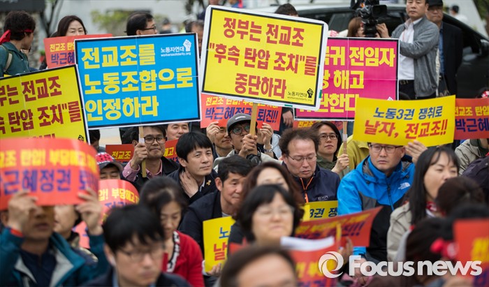 (서울=포커스뉴스) 27일 오후 서울 종로구 정부종합청사 앞에서 전교조(전국교직원노동조합)와 민주교육과 전교조 지키기 전국행동의 주최로 법외노조 후속조치 규탄 및 부당해고 저지, 노동기본권 쟁취를 위한 집회가 열리고 있다.