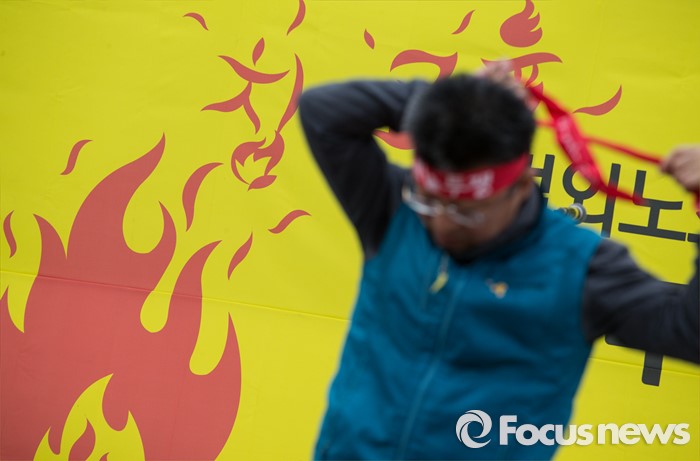 (서울=포커스뉴스) 27일 오후 서울 종로구 정부종합청사 앞에서 전교조(전국교직원노동조합)와 민주교육과 전교조 지키기 전국행동의 주최로 법외노조 후속조치 규탄 및 부당해고 저지, 노동기본권 쟁취를 위한 집회가 열리고 있다.