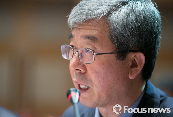 (광주=포커스뉴스) 문승현 광주과학기술원(GIST, 지스트) 총장이 25일 오후 광주과학기술원에서 열린 김종인 더불어민주당 비대위 대표와의 간담회에 참석해 업무보고를 하고 있다.