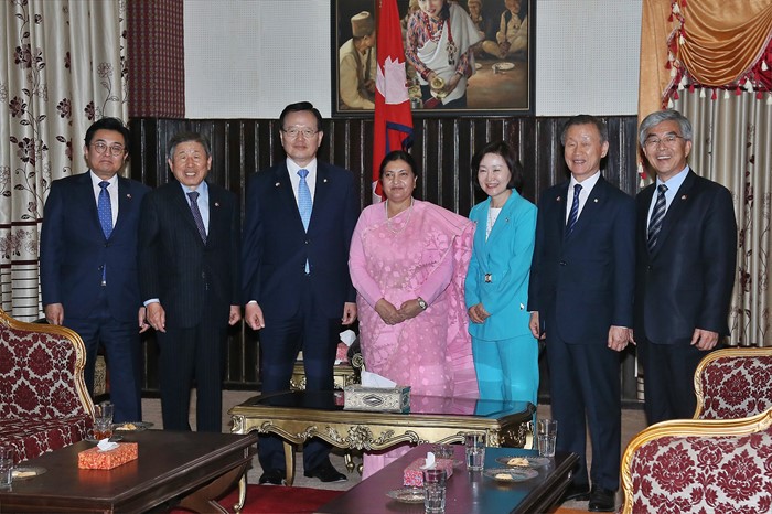 (서울=포커스뉴스) 정의화(왼쪽 세번째) 국회의장 등 의원단이 25일 오후(현지시각) 번다리(Bidhya Devi Bhandari, 오른쪽 네번째) 네팔 대통령을 만나 기념촬영을 하고 있다. <사진제공=국회>