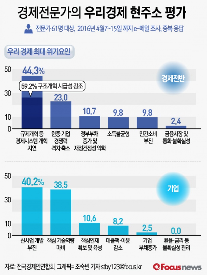 (서울=포커스뉴스) 25일 전국경제인연합회가 경제전문가 61명을 대상으로 '우리경제 현주소 평가 및 대책'을 조사한 결과에 따르면, 전문가들은 우리경제가 직면한 최대의 위기(중복응답)로 44.3%가 ‘경제시스템 개혁 지연’을 꼽았다.