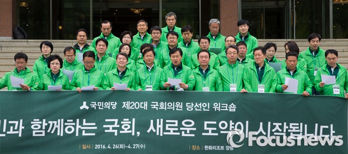 (양평=포커스뉴스) 안철수 국민의당 상임공동대표를 비롯한 20대 총선 당선자들이 27일 오전 경기도 양평 한화리조트에서 열린 20대 총선 당선자 워크숍에서 선언문을 낭독하고 있다.