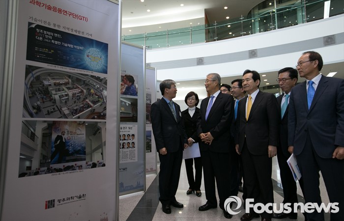 (광주=포커스뉴스) 김종인(왼쪽 두번째) 더불어민주당 비대위 대표 등 의원들이 25일 오후 광주과학기술원(GIST, 지스트)을 방문해 문승현(왼쪽 첫번째) 총장으로부터 설명을 듣고 있다.