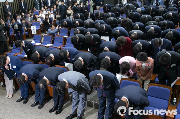 (서울=포커스뉴스) 원유철(앞줄 오른쪽 세번째) 새누리당 원내대표를 비롯한 제20대 총선 당선자들이 26일 오전 서울 여의도 국회에서 열린 당선자 워크숍에 참석해, 허리숙여 인사하고 있다.