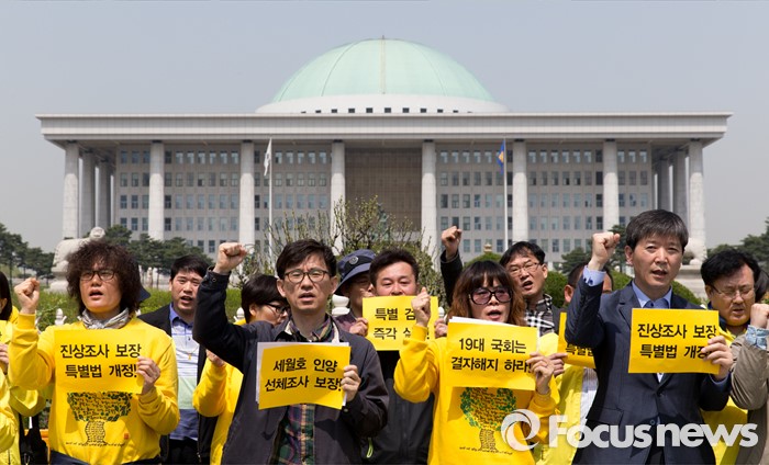 (서울=포커스뉴스) 25일 오전 서울 여의도 국회의사당 정문 앞에서 4월 16일의 약속국민연대 관계자들이 세월호 진상규명 특별법 개정 및 특검 실시 촉구 기자회견을 하고 있다.