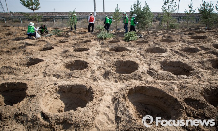 (다라더치/중국=포커스뉴스) 25일 오전 중국 내몽고 다라더치 쿠부치사막에서 2016 미래숲 15기 녹색봉사단원들이 나무 심기 작업을 하고 있다. 미래숲 녹색봉사단은 이번 봉사활동을 통해 황폐화된 사막에 나무 심기 및 각국 청년들과 우호를 증진을 위한 교류 활동을 전개했다.