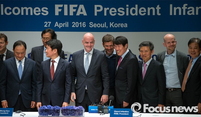 (서울=포커스뉴스) 한국을 방문한 지아니 인판티노(46, 스위스) FIFA 회장이 27일 오후 서울 강남구 아이파크타워에서 열린 기자회견에 참석, 주요 내빈과 함께 단체사진을 찍고 있다.