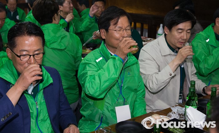 (양평=포커스뉴스) 천정배 국민의당 공동대표를 비롯한 당선인들이 26일 오후 경기도 양평 한화리조트에서 열린 국민의당 20대 총선 당선자 워크숍에 참석, 저녁식사 중 건배를 하고 있다. 왼쪽부터 박지원 의원, 천 대표, 이용호 당선인.