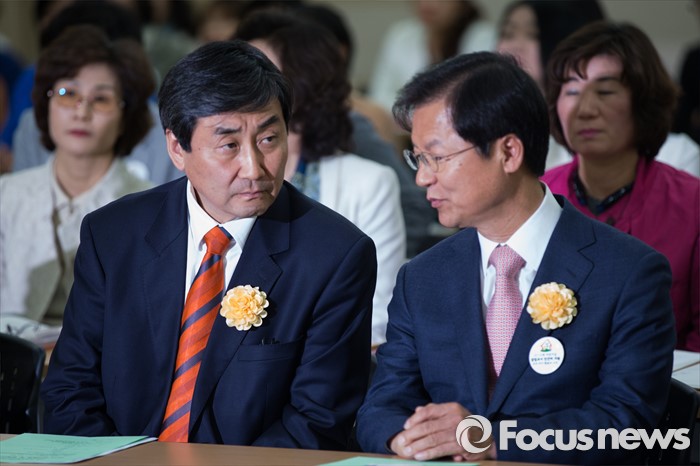 (서울=포커스뉴스) 27일 오후 서울 영등포구 이룸센터에서 열린 한국가정어린이집연합회 정기총회에 이종걸(왼쪽)더불어민주당 원내대표와 천정배 국민의당 공동대표가 참석해 대화를 나누고 있다.