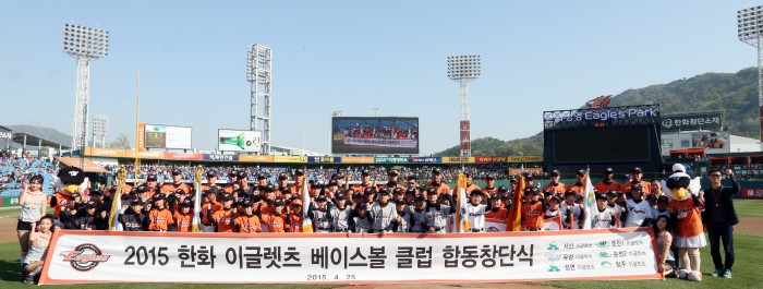 한편 한화는 유소년 야구교실도 운영한다.초등학생이면 누구나 참가 신청이 가능하다.프로야구 한화가 30일 대전 삼성전에 앞서 '제4기 한화이글렛 베이스볼클럽 창단식'을 연다. 사진은 지난해 열린 '제3기 한화이글렛 베이스볼클럽 창단식' 뒤 기념촬영하는 모습. <사진제공=한화 이글스>