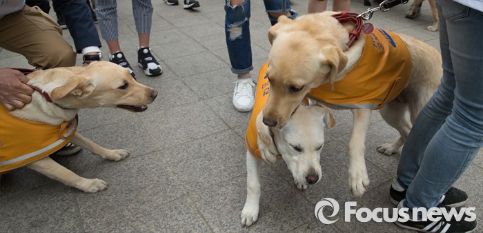 (서울=포커스뉴스) 27일 오전 서울 청계천에서 삼성화재안내견학교 훈련사들과 안내견들이 시민들과 함께 '안내견과의 만남' 행사를 하고 있다.
