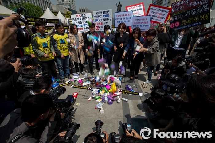 (서울=포커스뉴스) 25일 오전 서울 종로구 광화문 광장에서 옥시 가습기 살균제 피해 가족 및 환경단체 관계자들이 옥시 상품 불매를 촉구하는 퍼포먼스를 펼치고 있다.