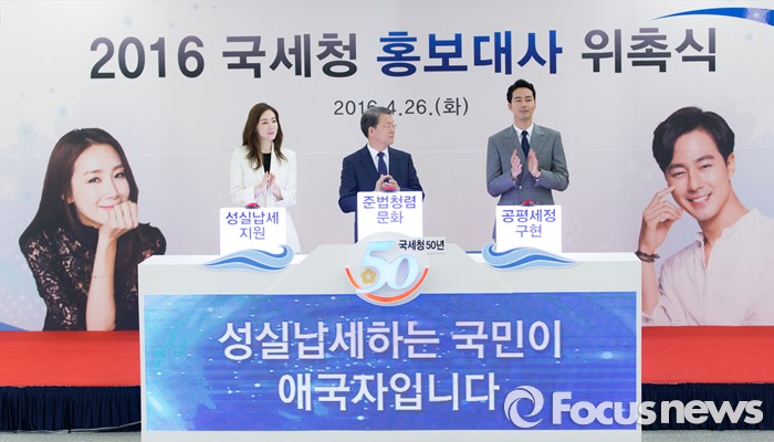 (서울=포커스뉴스) 26일 오후 서울 종로구 서울지방국세청에서 임환수(가운데) 국세청장이 홍보대사로 위촉된 배우 조인성(오른쪽), 최지우와 홍보대사 위촉 퍼포먼스를 하고 있다.