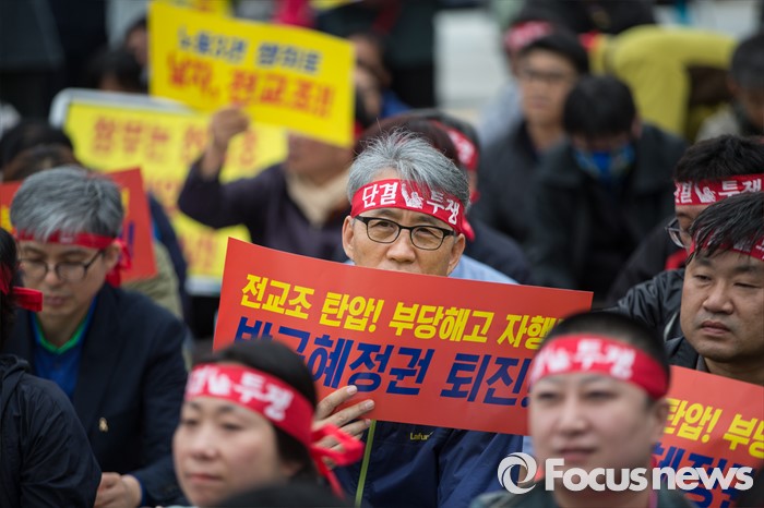 (서울=포커스뉴스) 27일 오후 서울 종로구 정부종합청사 앞에서 전교조(전국교직원노동조합)와 민주교육과 전교조 지키기 전국행동의 주최로 법외노조 후속조치 규탄 및 부당해고 저지, 노동기본권 쟁취를 위한 집회가 열리고 있다.