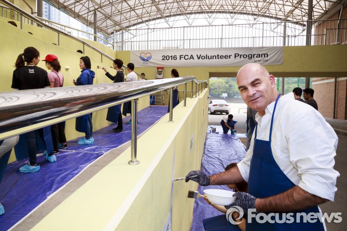 한편 FCA 코리아는 이번 벽화 그리기·채색 활동에 임직원 재능기부를 뿐 아니라 페인트, 붓, 각종 부자재 등에 소요되는 경비 일체도 부담하기로 하고 500만원의 후원금을 지원했다.22일 서울시 송파구 가락중학교에서 파블로 로쏘 FCA 코리아 사장이 벽화 그리기 봉사활동을 하는 모습.<사진제공=FCA 코리아>