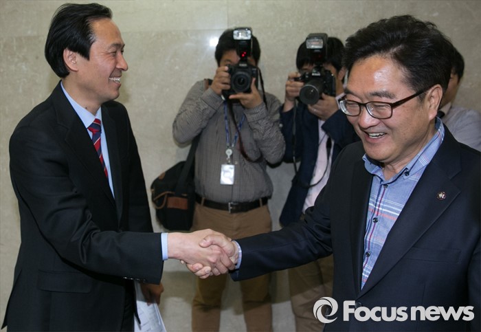 (서울=포커스뉴스) 원내대표 경선에 출마하는 우상호(왼쪽), 우원식 더불어민주당 의원이 29일 오후 서울 여의도 국회 정론관 앞에서 만나 악수하고 있다.