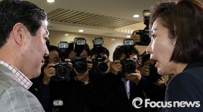 (서울=포커스뉴스) 새누리당 차기 원내대표 경선 후보등록 마감 예정일인 1일 오전 서울 여의도 국회 정론관 앞에서 차기 원내대표 후보군으로 거론되는 유기준(왼쪽), 나경원 의원이 대화하고 있다.