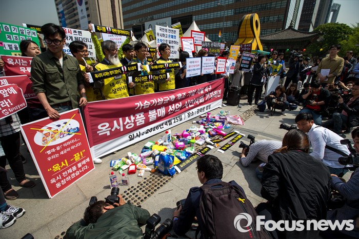(서울=포커스뉴스) 25일 오전 서울 종로구 광화문 광장에서 옥시 가습기 살균제 피해 가족 및 환경단체 관계자들이 옥시 상품 불매를 촉구하는 기자회견을 하고 있다.