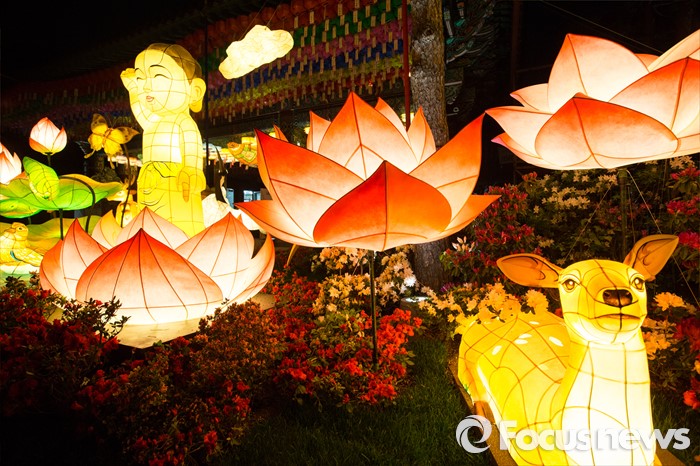 (서울=포커스뉴스) 부처님오신날을 앞두고 26일 밤 서울 종로구 견지동 조계사 정문 앞에 다양한 형태의 연등들이 불을 밝히고 있다.