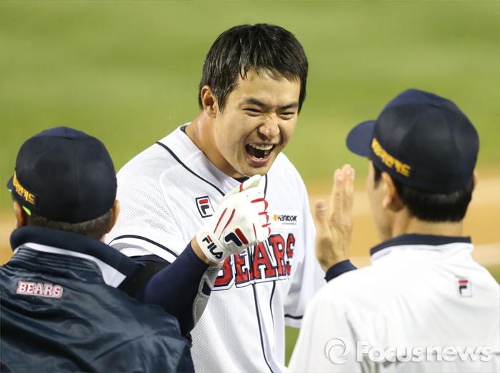 (서울=포커스뉴스) 28일 서울 잠실구장에서 열린 2016 프로야구 SK-두산 경기 9회말 1사 1,2루에서 끝내기 우월 3점홈런을 날린 두산 김재환이 김태형 감독과 한용덕 코치의 축하를 받고 있다.