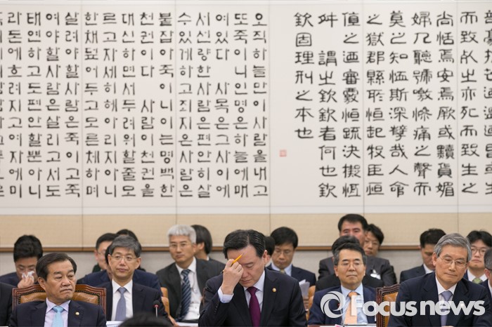 (서울=포커스뉴스) 김현웅(앞줄 가운데) 법무부 장관과 황인무(앞줄 왼쪽) 국방부 차관, 고영한(앞줄 오른쪽) 법원행정처장 등 공무원들이 28일 오후 서울 여의도 국회에서 열린 법제사법위원회 전체회의에 출석해, 개회를기다리고 있다.