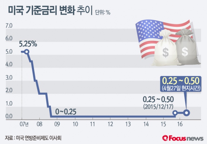 (서울=포커스뉴스) 미국 연방준비제도는 4월 27일(현지시간) 통화정책 결정기구인 연방공개시장위원회(FOMC) 정례회의를 열고 지난해 12월 0.25%~0.50%로 인상된 기준금리를 위원 만장일치로 동결했다.