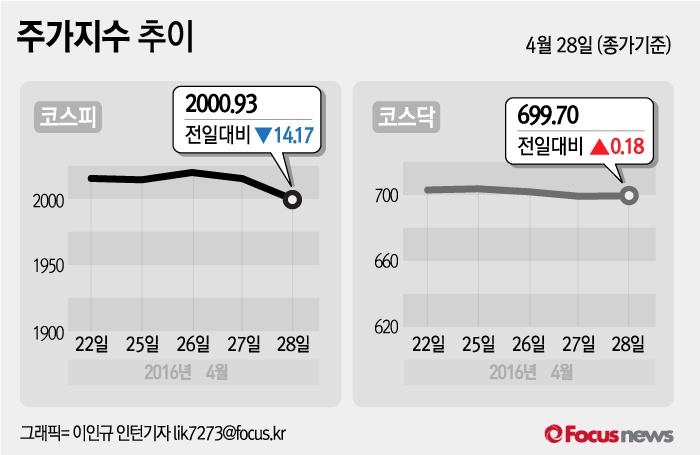 (서울=포커스뉴스) 28일 코스피지수는 전날 보다 0.72%(14.47포인트) 내린 2000.93에 장을 마쳤다. 코스닥지수는 전일 대비 0.03%(0.18포인트) 오른 699.70에 마감했다.