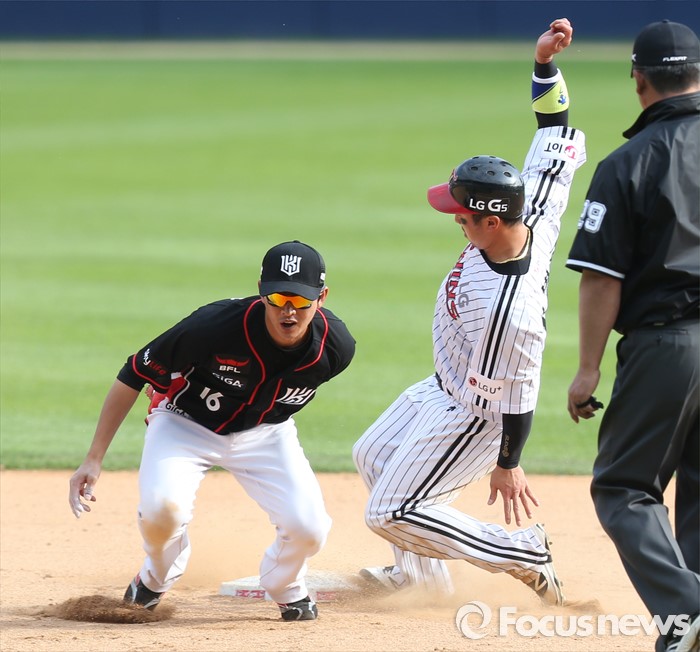 (서울=포커스뉴스) 1일 서울 잠실구장에서 열린 2016 프로야구 kt-LG 경기 7회말 2사후 볼넷으로 출루한 LG 이병규가 오지환 타석때 2루 도루를 시도하다 아웃되고 있다.