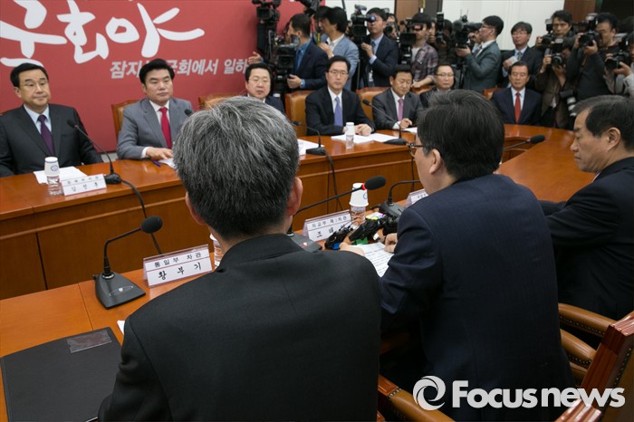 (서울=포커스뉴스) 원유철(뒷줄 왼쪽 두번째) 새누리당 대표최고위원 권한대행을 비롯한 의원들이 28일 오전 서울 여의도 국회에서 열린 대북 관련 긴급 안보 대책회의에 참석해, 조태열(앞줄 가운데 뒷모습) 외교부 2차관의 발언을 경청하고 있다.