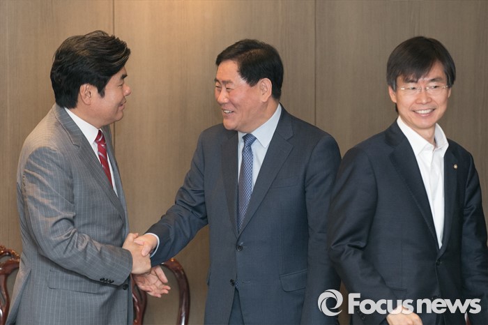 (서울=포커스뉴스) 원유철(왼쪽) 새누리당 원내대표와 최경환(가운데) 의원이 25일 오후 서울 여의도의 한 중식당에서 열린 중진의원 오찬 간담회에 참석해 악수하고 있다. 오른쪽은 조경태 의원.
