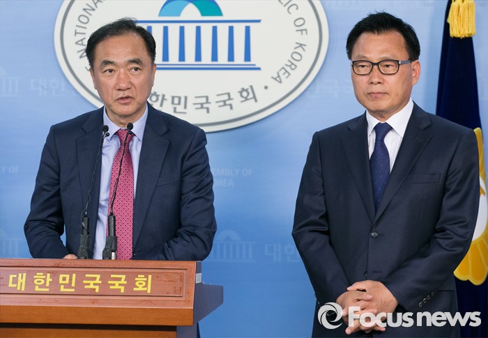 (서울=포커스뉴스) 정장선(왼쪽) 더불어민주당 총무본부장과 박광온 대변인이 27일 오전 서울 여의도 국회 정론관에서 전당대회 일정 등과 관련 브리핑을 하고 있다.