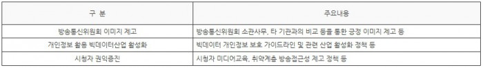 최성준 방송통신위원회 위원장은 “이번 공모전을 통해 일반 국민들이 방송통신정책을 보다 쉽게 이해하고, 홍보와 콘텐츠 제작에 관심 있는 유능한 인재들이 많이 참여하기를 기대한다”고 밝혔다.방송통신 정책 홍보 콘텐츠 주요내용.<표제공=방통위>