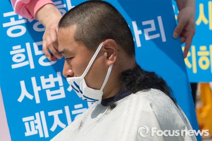 (서울=포커스뉴스) 26일 오전 서울 영등포구 국회의사당 앞에서 사법시험 준비 고시생 이종배씨가 사법시범 존치를 촉구하며 삭발을 하고 있다.