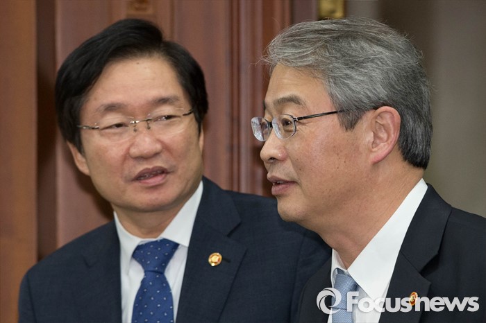 (서울=포커스뉴스) 28일 오후 서울 종로구 정부서울청사에서 김영석(왼쪽) 해양수산부 장관과 임종룡 금융위원장이 '경제관계장관회의'가 참석하고 있다.